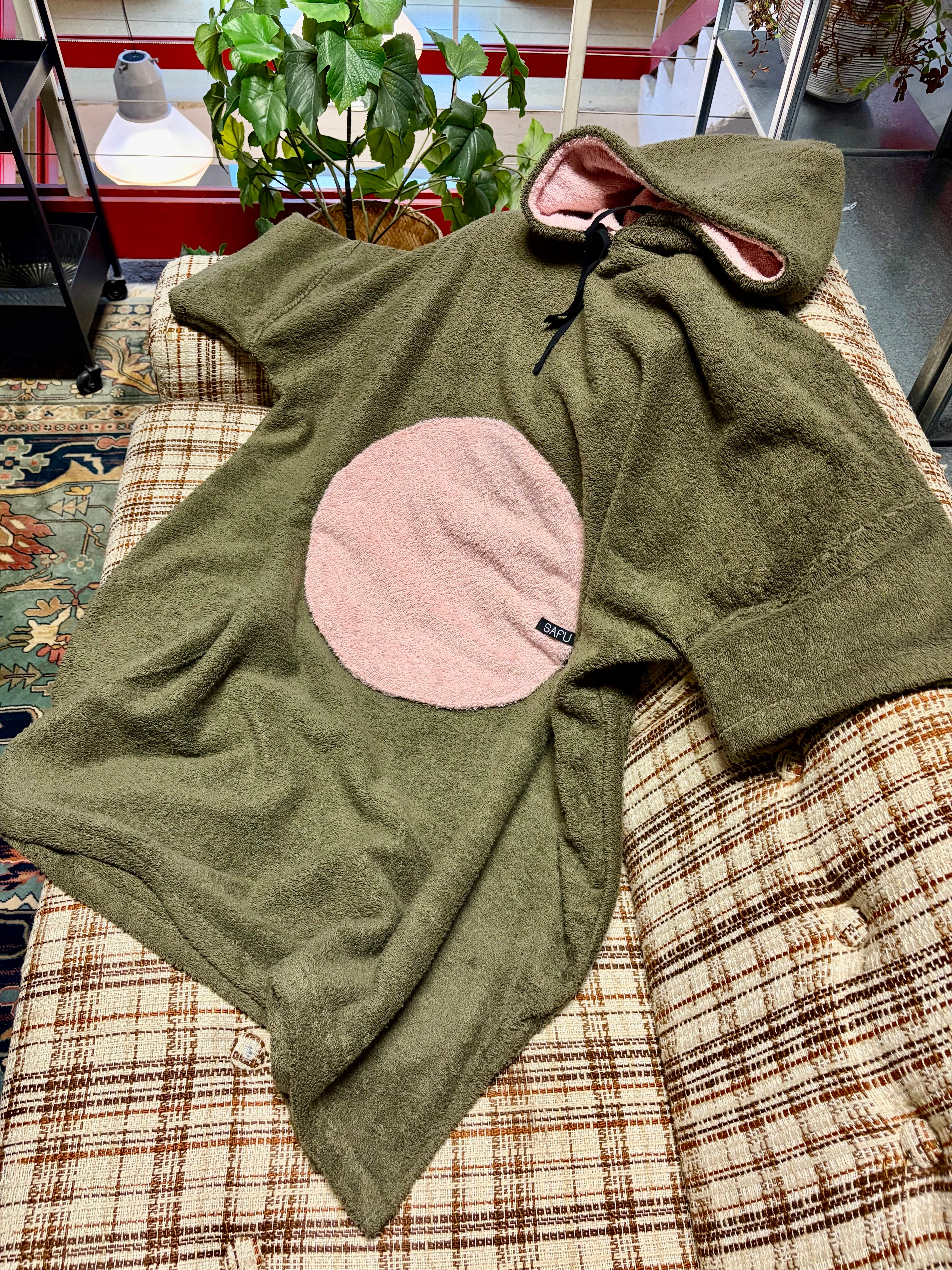 Limited Edition Terry Poncho for those who appreciate quiet luxury and thoughtfully designed comfort. Crafted from luxuriously soft premium terry cotton, it keeps you warm after cold water swims, surf sessions, or time in the sauna. The two-tone design blends army green and nude pink into a timeless, balanced aesthetic.